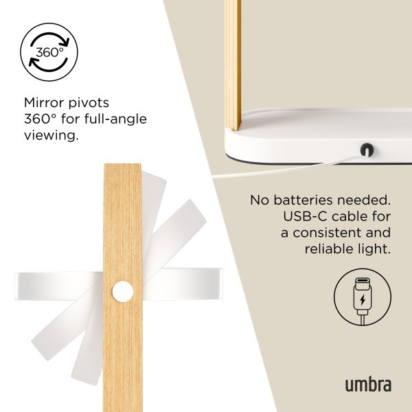 Непрекъсната LED светлина обгръща периметъра на огледалото, осигурявайки равномерно осветяване. Вградената тава държи най-важното под ръка, а включеното USB-C захранване осигурява надеждна употреба без батерии.