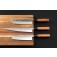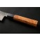 Дръжката на ножа е създадена с особено внимание към материалите и детайлите. Основният компонент е кевазинго – рядка африканска дървесина, позната още като Bubinga. Тя впечатлява със своя дълбок червеникаво-кафяв тон, преминаващ в по-тъмни ивици и фигури, наподобяващи пламъци. Кевазингото е изключително твърдо и стабилно, което го прави идеален избор за дръжки на висококачествени ножове. В допълнение, в конструкцията е вложен и абанос – една от най-ценните тъмни дървесини, известна със своята наситено черна окраска, висока плътност и благороден характер. Съчетавайки топлината и декоративната красота на кевазингото с елегантния контраст на абаноса, дръжката придобива не само впечатляваща визия, но и усещане за баланс и лукс.