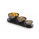 Съдържанието блести ярко, докато ултрамодерните купи остават сдържани по цвят. Придружаващата ги табла за сервиране, изработена от тъмно мангово дърво, е с прецизно пасващи вдлъбнатини, за да се гарантира, че купите ще стоят спретнато там, където им е мястото.