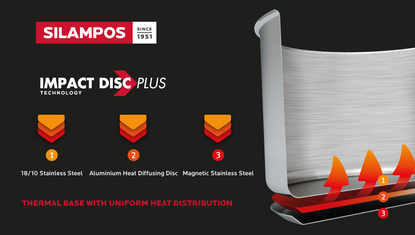 Благодарение на тройното дъно с Impact Disc, съдовете за готвене Silampos не се нуждаят от максимална температура ( на котлона) при готвене, тъй като термодъното разпределя топлината равномерно и ефективно по цялата повърхност.