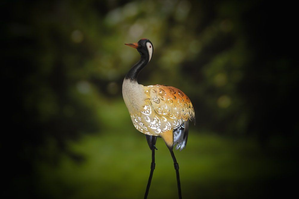Метална декорация за двор, наподобяваща птица жерав. Когато се стъмни, LED светлината вътре в птицата светва и създава красиви декоративни светлинни шарки по двора/стената.