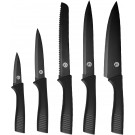 MasterChef - Комплект ножове 5 ч. - Noiranja• Материал: неръждаема стомана, PP• Размери на опаковката: 38,8 х 26,1 х 3,2 см.• Комплектът съдържа: - Нож на майстора - 20 см - Нож за хляб - 20 см - Нож Сантоку- 14 см - Универсален нож - 13 см. - Нож за белене - 9 см. • Цвят: черен• Ръчно заточени• Тегло: 0,685 кг.Производител: Arovo BV / Нидерландия