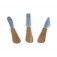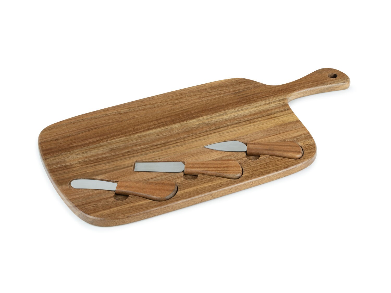 Вдлъбнатините в дъската осигуряват място на трите ножа за сирена от неръждаема стомана – всеки с ергономична дървена дръжка и предназначени съответно за твърди, меки и кремообразни сирена.