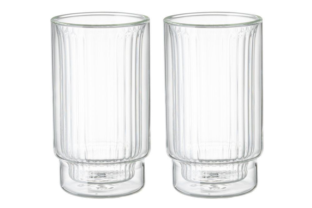 ♦ Дизайн: Чашите са изработени от прозрачно боросиликатно стъкло с елегантно оребрена вътрешна стена. Двустенната конструкция осигурява изолация, като поддържа студените напитки студени, а топлите топли за по-дълго време. Външната повърхност на чашата остава приятна на допир.