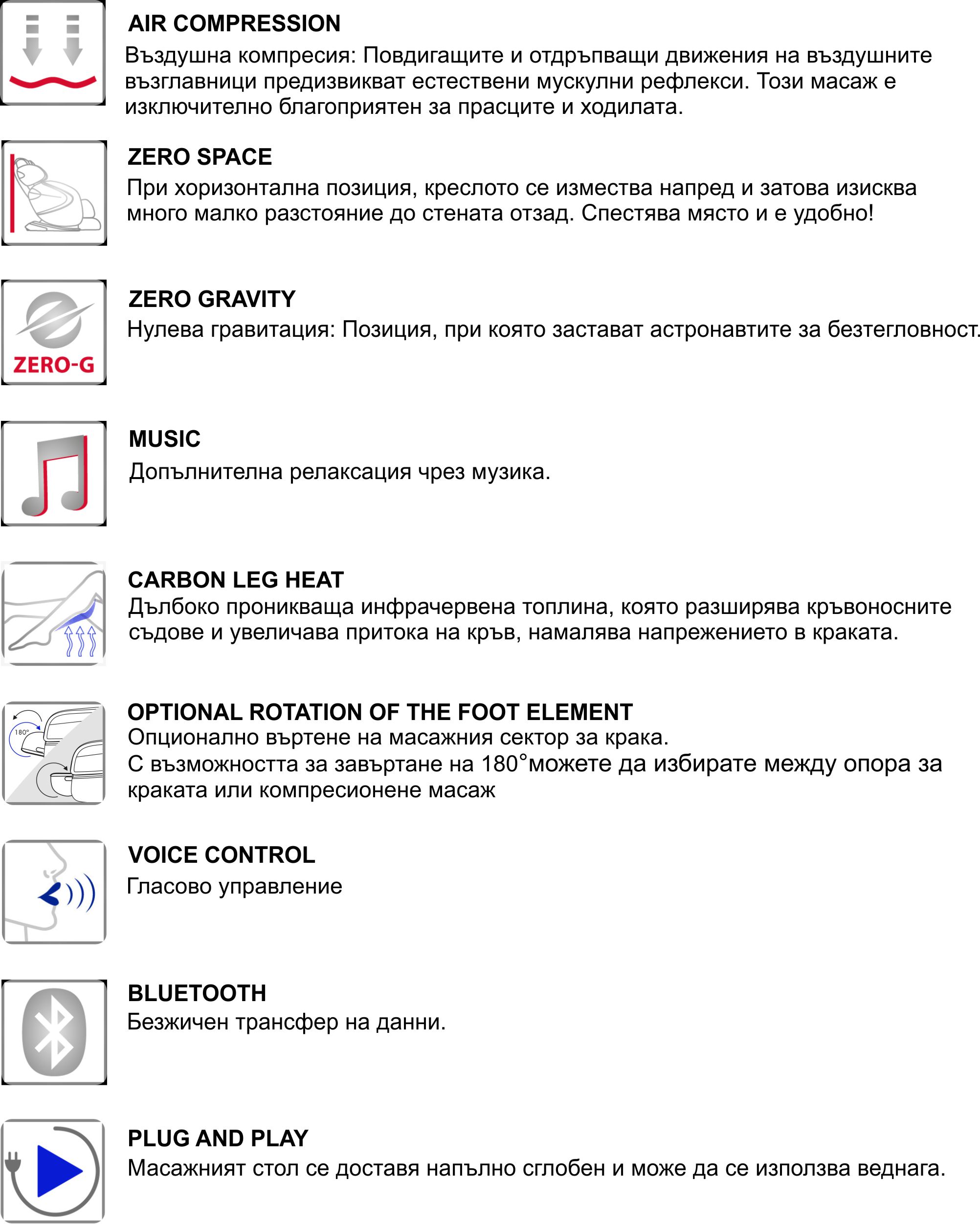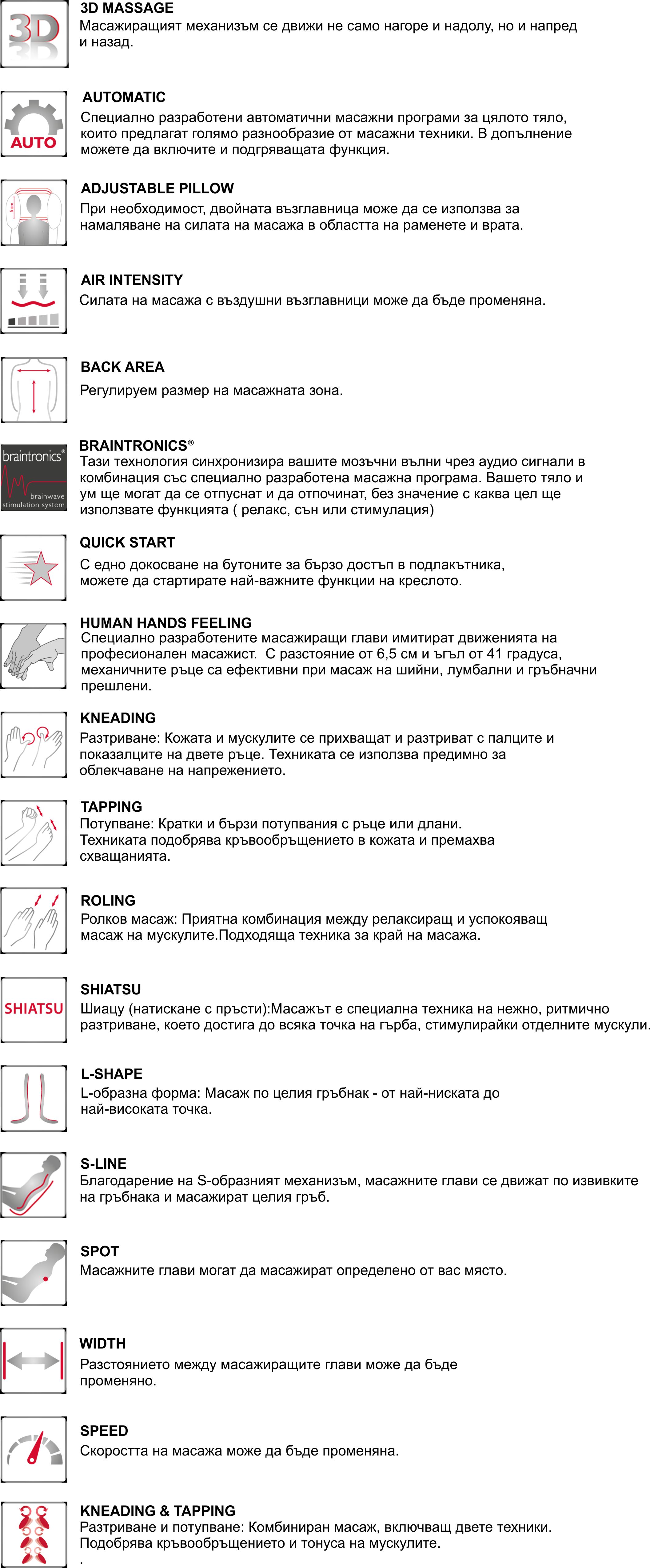 Технологията Braintronics® синхронизира вашите мозъчни вълни с аудио стимулация и предоставя на тялото ви изцяло нов вид релакс в комбинация със специално разработени програми за масаж. Сякаш сте потопени в дълбока медитация, вие ще възстановите напълно за 21 минути и ще премахнете емоционалния и физически стрес.