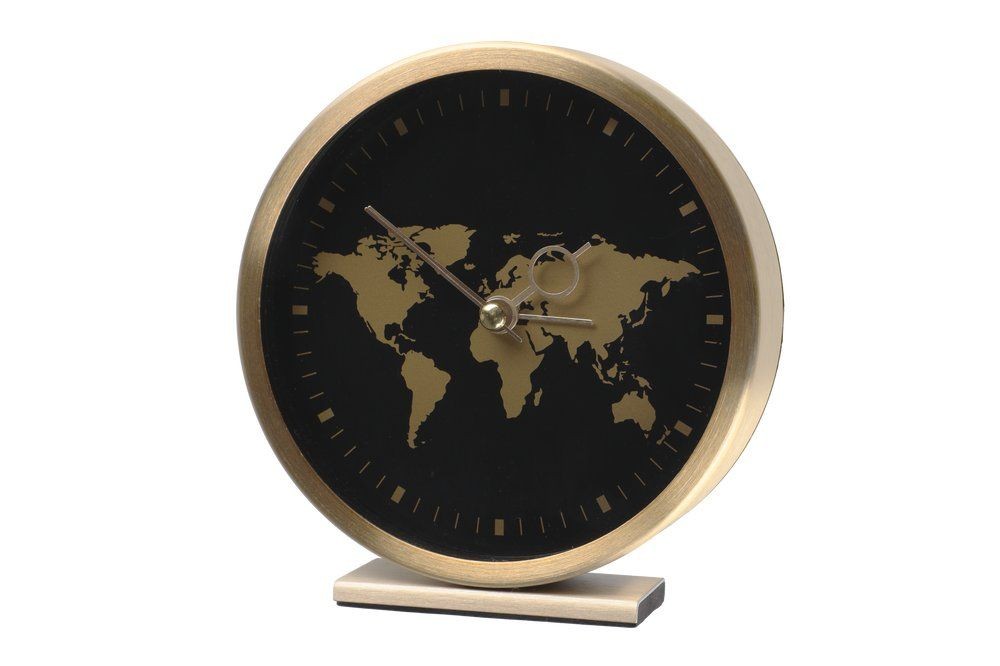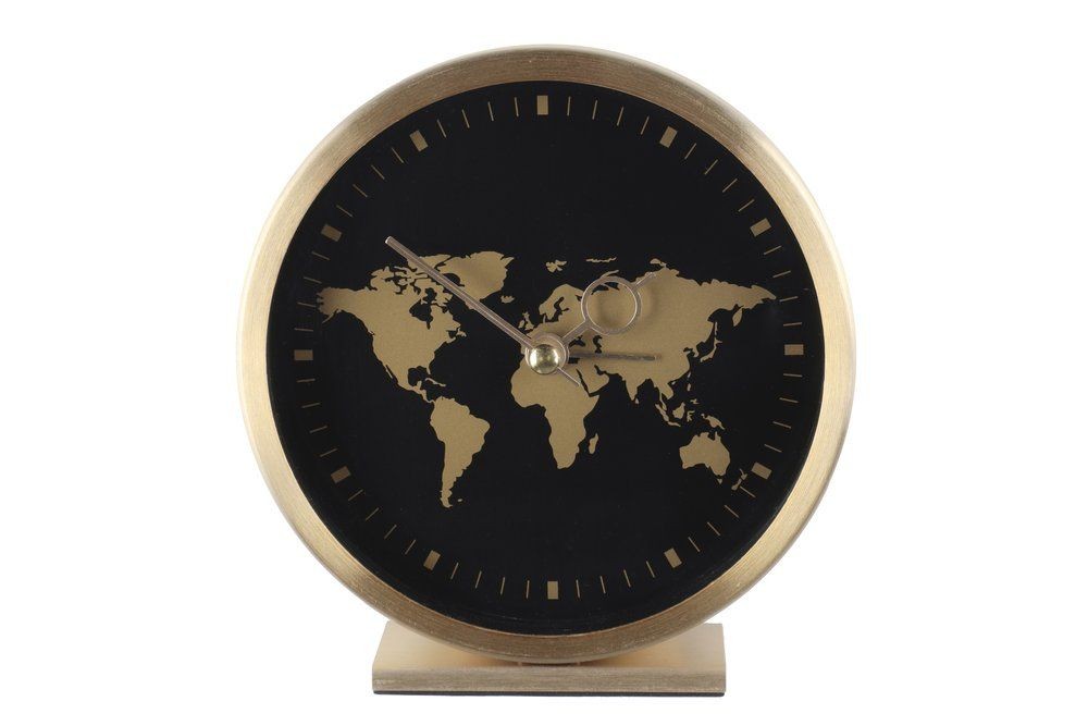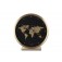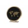Будилникът Globe е с алуминиева рамка в златист цвят, черен циферблат и карта в златист цвят.