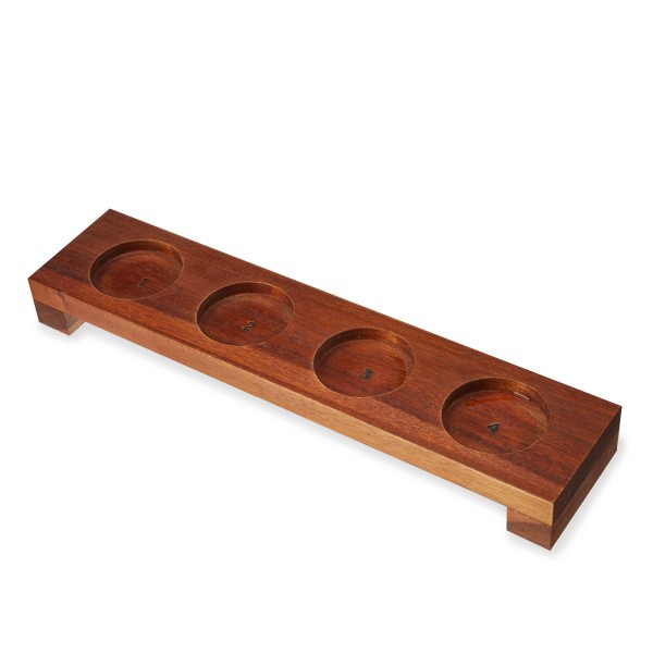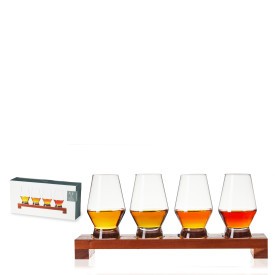 Комплектът включва четири кристални чаши от 240 мл и лека, но здрава дървена подложка.