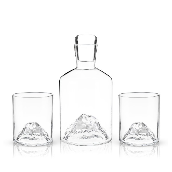 Този комплект кристален декантер и чаши отдават почит на високите върхове на Тихоокеанския северозапад с ръчно издухана, обемна планинска основа. Ръчно изработени артикули.